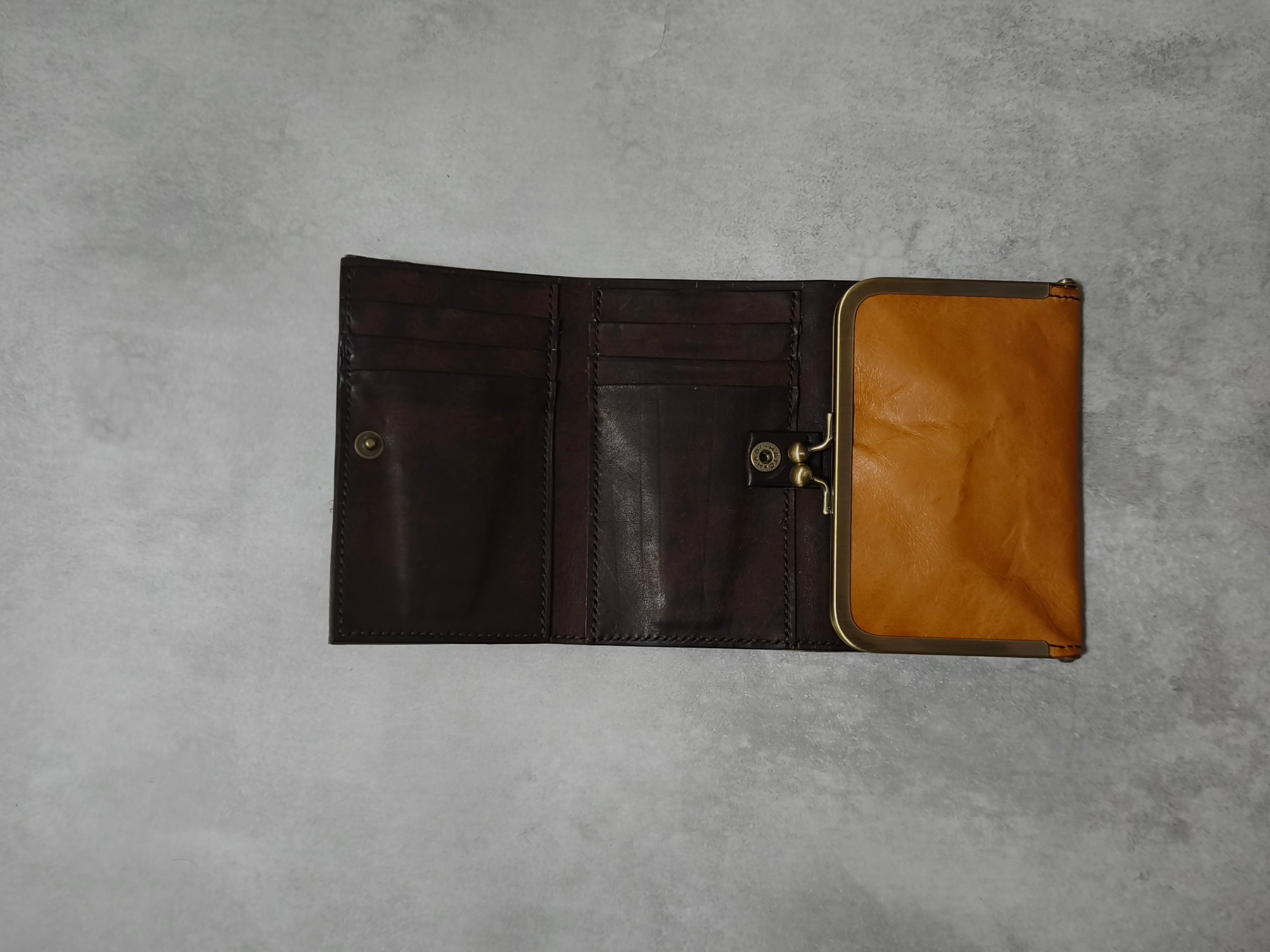 内側はダークブラウン、外側はキャメルのバイカラーで、ガマ口(金具付き小銭入れ)が特徴です。